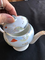 This is a 4 ½" white china teapot with knobbed lid. It has a hand-painted Japanese pattern design in orchid, green, red, and gold – with medallions of floral. It has #65 in gold paint on the bottom. Measures 6 ½" long. There is a fine hairline on the rim of the orchid.